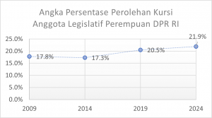 Angka perolehan kursi menjadi hasil akhir yang menunjukkan keterwakilan perempuan di lembaga legislatif (DPR RI). Data perolehan suara caleg perempuan terus meningkat mencapai 24.5% pada pemilu 2024, data perolehan kursi anggota legislatif perempuan juga menunjukkan tren yang sama mencapai 21.9% pada pemilu 2024 (127 kursi aleg perempuan dari 580 kursi DPR RI). Bisa dilihat pada grafik di bawah ini.